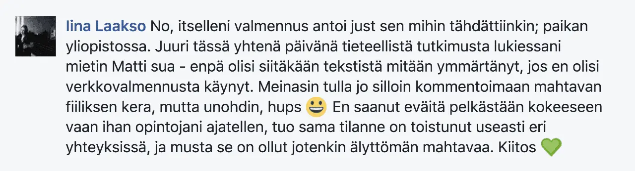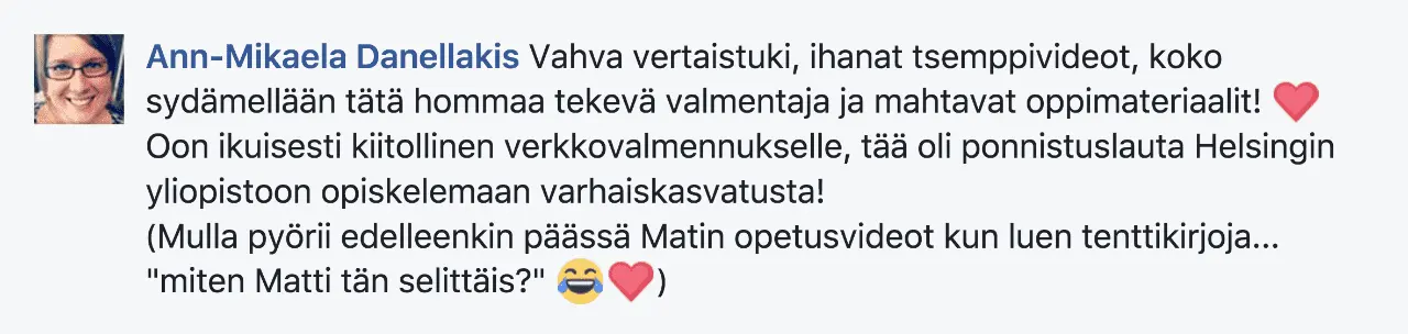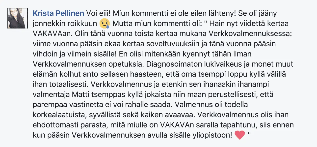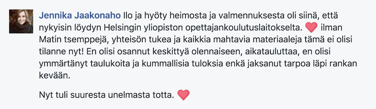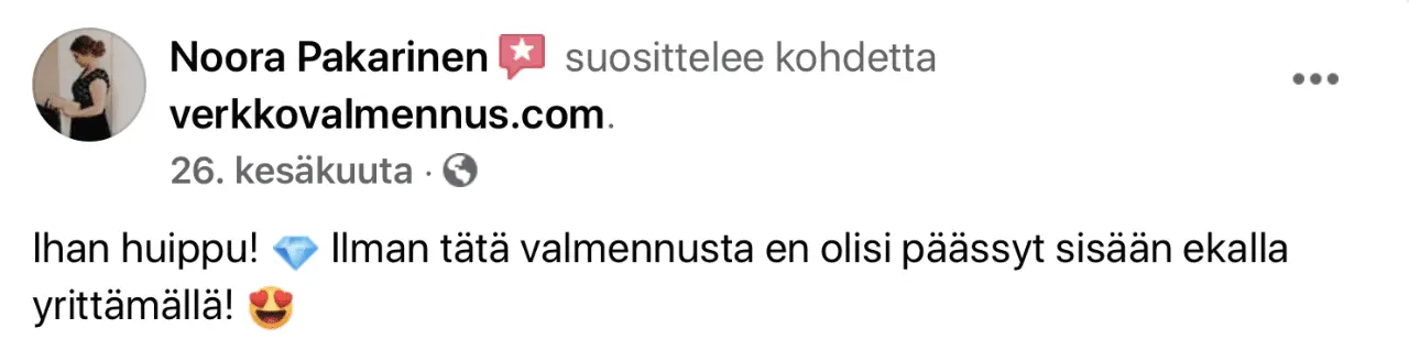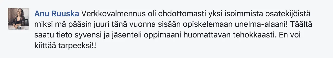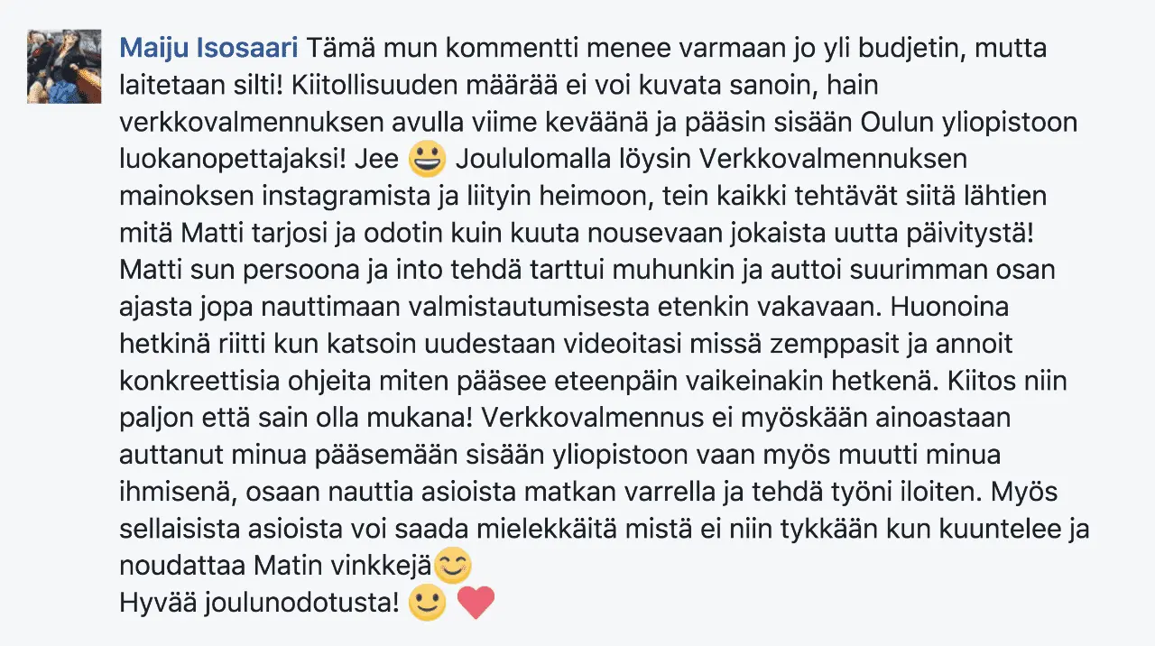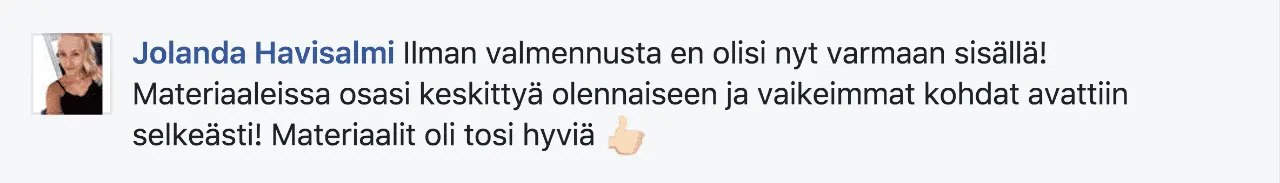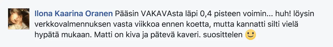Huippu tekemistä teiltä, kiitos paljon valmennuksesta! Sain niin paljon varmuutta omaan tekemiseen ja hyviä vinkkejä, joita ilman en olisi pärjännyt näin hyvin!