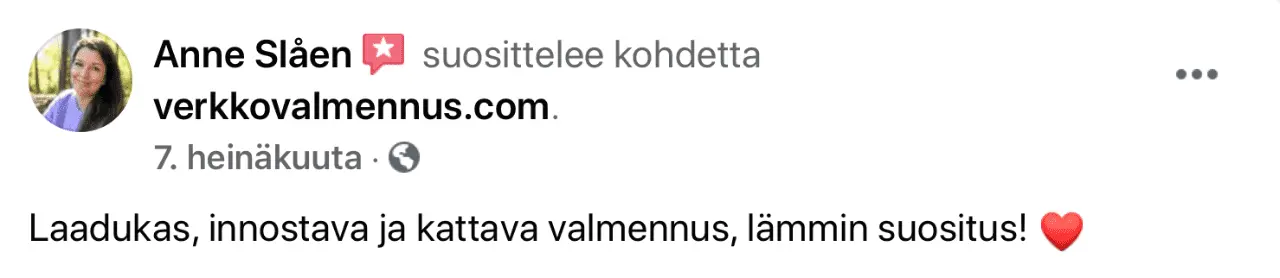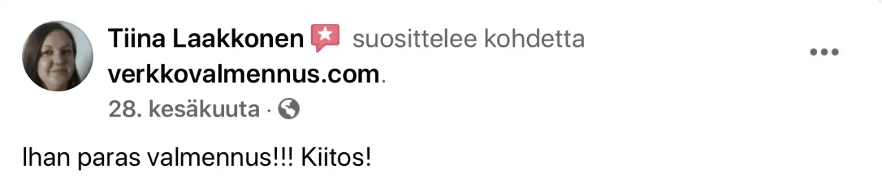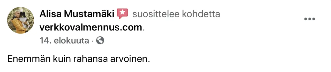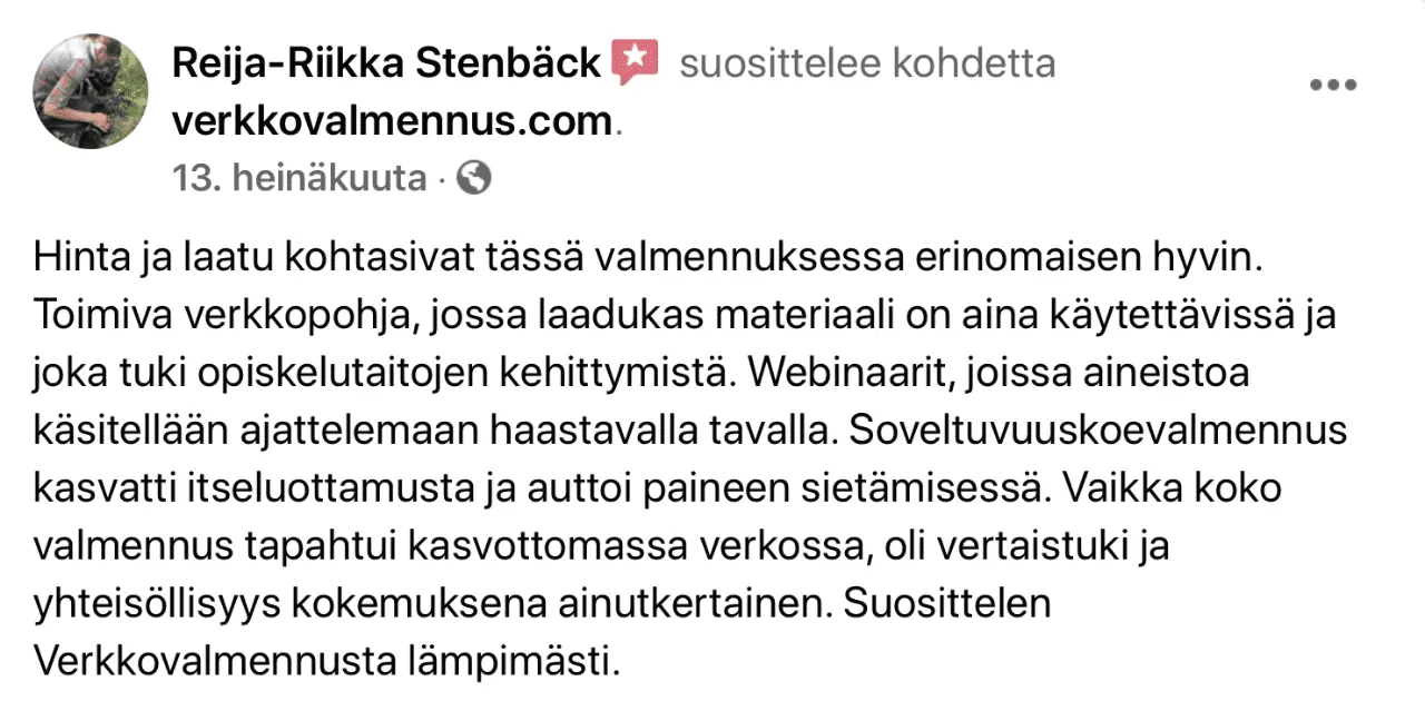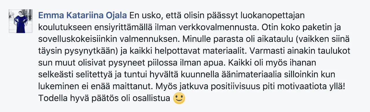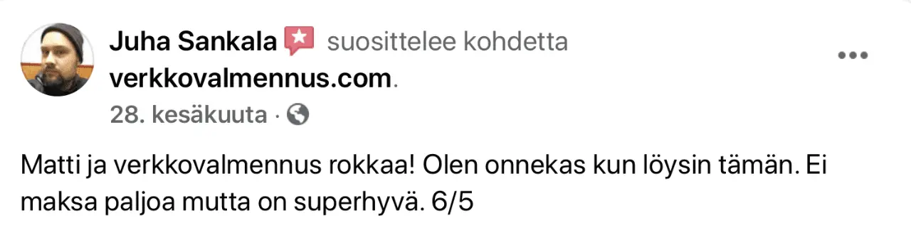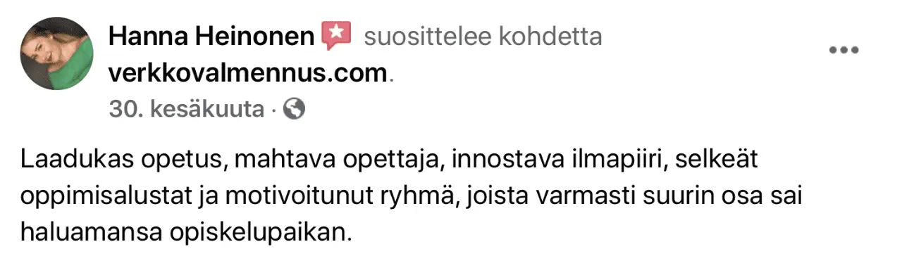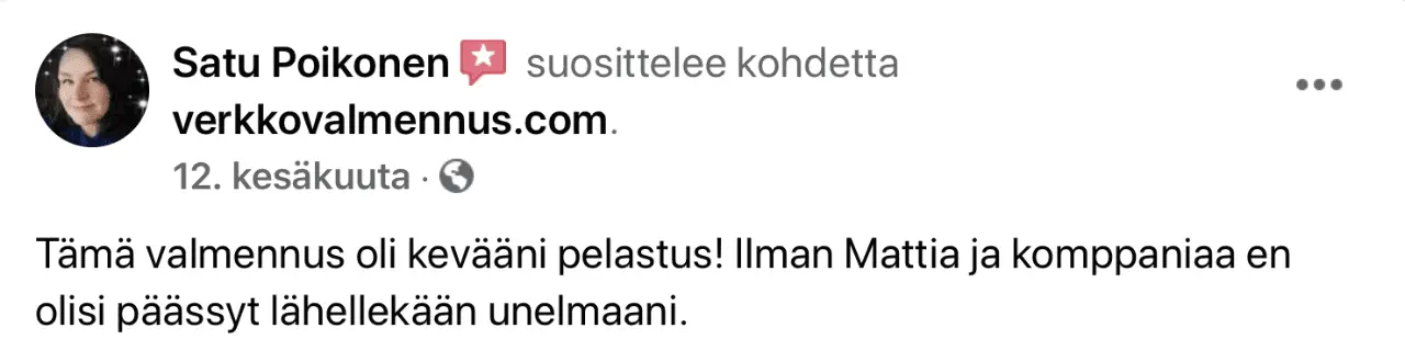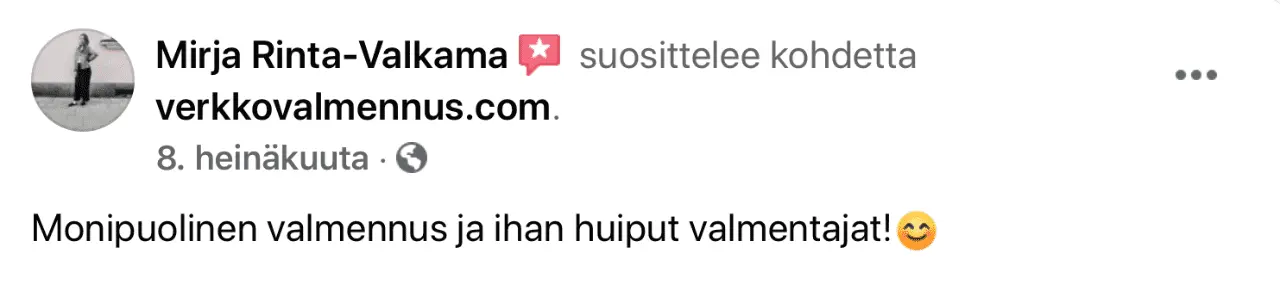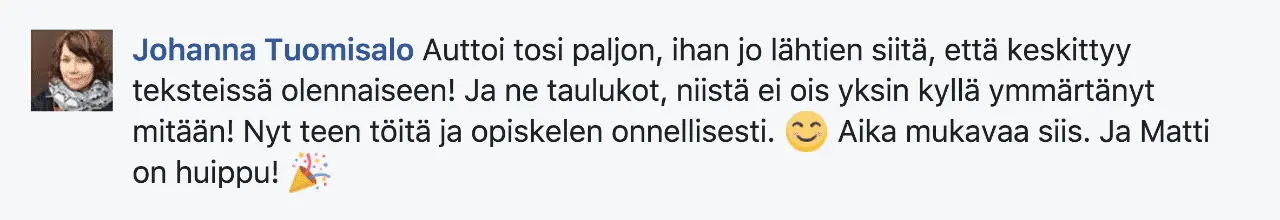 Huippu tekemistä teiltä, kiitos paljon valmennuksesta! Sain niin paljon varmuutta omaan tekemiseen ja hyviä vinkkejä, joita ilman en olisi pärjännyt näin hyvin!