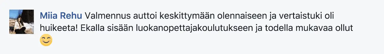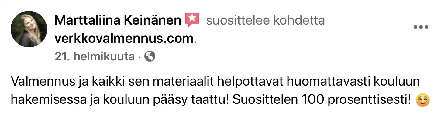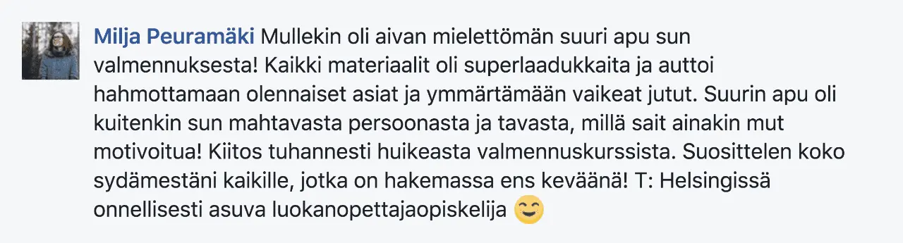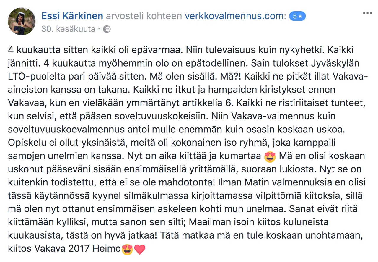 Sain valmennuksesta ihan hurjasti itsevarmuutta sekä sadat harjoituskysymykset helpotti hurjasti omaa ajatusmaailmaa ja tuntemusta itsestä. En voi kun suositella! Niin, ja tänä vuonna pääsin sisään 🥰 Kiitos teille siis!