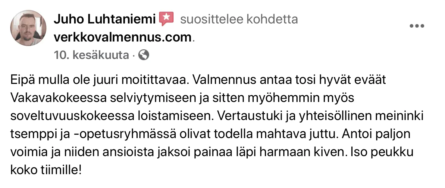 PS. Katso tältä sivulta palautteemme ja video, jossa asiakkaamme kertovat soveltuvuuskokeen valmennuksestamme. Sen katsottuasi tiedät mistä on kysymys ja millaista luottamusta valmennuksemme herättävät.